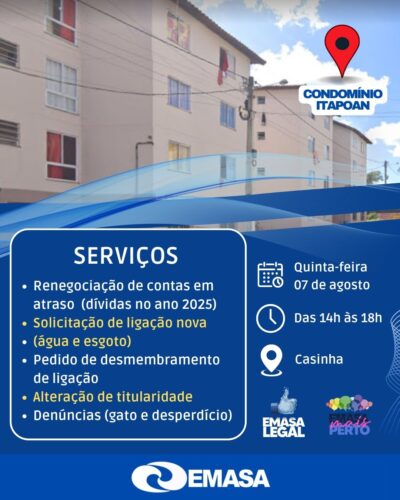 A Empresa Municipal de Águas e Saneamento (EMASA) leva nesta quinta-feira, dia 7, das 14h às 18h, o programa EMASA Mais Perto ao Condomínio Itapoan, em Itabuna. A ação tem como objetivo facilitar o acesso da comunidade aos principais serviços da empresa e oferecer condições especiais para a regularização de débitos.